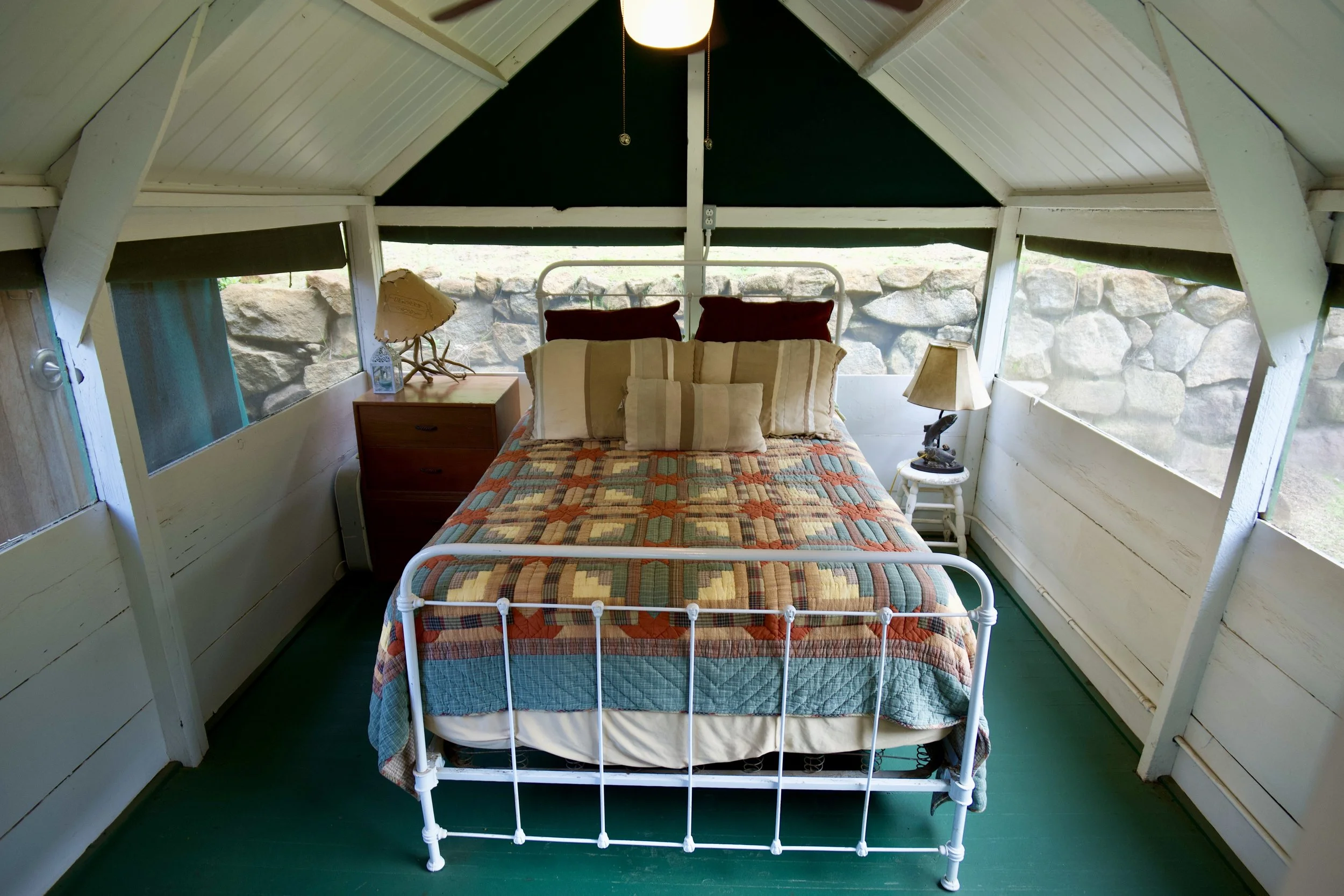 <- BOOK Forest Huts are a more paired-down option for two, offering A/C, with a shared bathroom and shower between the two huts. Simple, peaceful, and steps from the music. BOOK